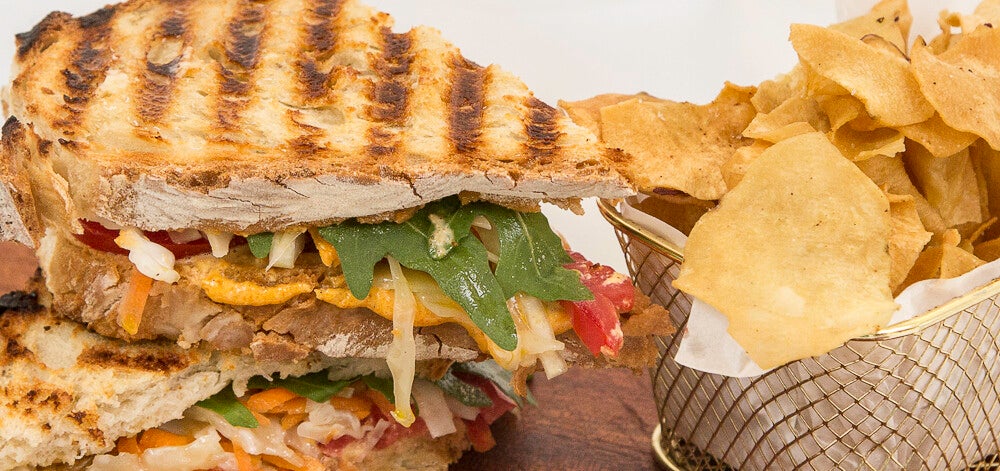 pão fatiado, peito de frango, molho americano, salada de repolho e cenoura, tomate, rúcula e chips de batata doce